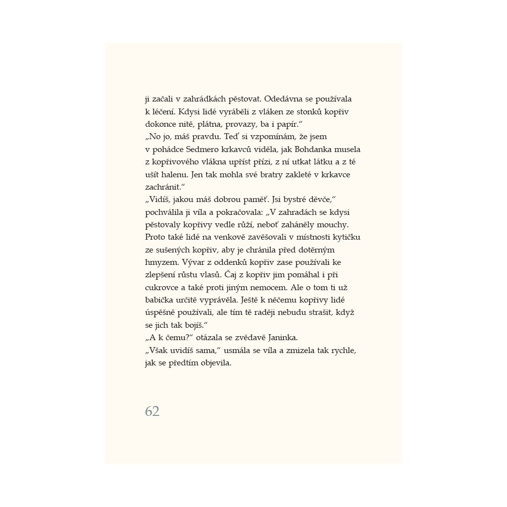 Když holčička Janinka objeví na půdě babiččiny chaloupky starodávný ilustrovaný herbář, začnou se dít podivné věci. Herbář je totiž kouzelný a ukrývá v sobě neuvěřitelná překvapení. S pomocí víl se holčička dostane do čarovné říše víl a skřítků, kde zažije neobyčejná dobrodružství a pozná mnohá tajemství týkající se léčivých rostlin. Na konci každé z deseti krátkých kapitol jsou pro děti připraveny cvičné otázky, aby si připomněly zajímavosti a poznatky, které se v příběhu dozvěděly.