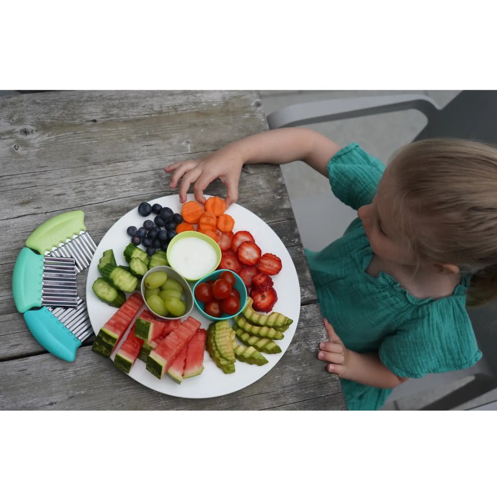 S trojicí vlnkovacích kráječů Melii v růžové, šedé a fialové barvě proměníte každé jídlo v zábavu. Ideální pro BLW, dětské salátky i hravé sendviče – bezpečně, jednoduše a s úsměvem.