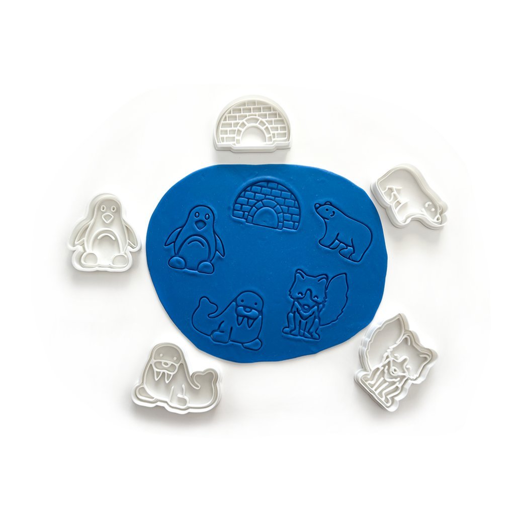 Sada vykrajovátek Severní pól (5 ks) – iglú, medvěd, liška, tučňák a mrož na tvoření z modelíny nebo kinetického písku . Děti snadno vykouzlí celý polární svět, kde si samy vytvářejí příběhy o sněhových dobrodružstvích. Při mačkání, vyhlazování a vykrajování si přirozeně procvičují jemnou motoriku, rozvíjejí fantazii a objevují radost ze smyslového hraní.