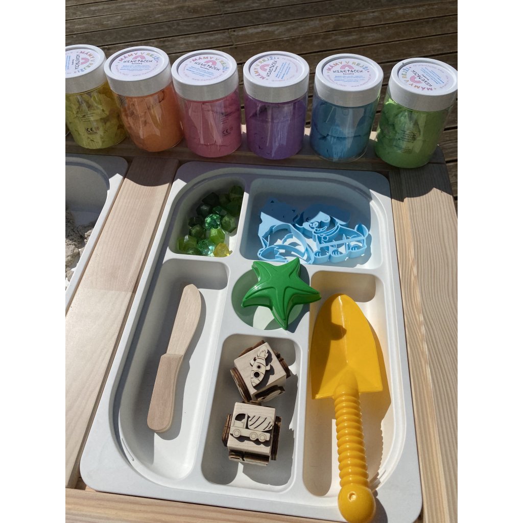 - Kinetické písky – ideální pro senzorické hraní bez nepořádku. Drží tvar, krásně se s ním tvoří a děti si u něj trénují soustředění i trpělivost.